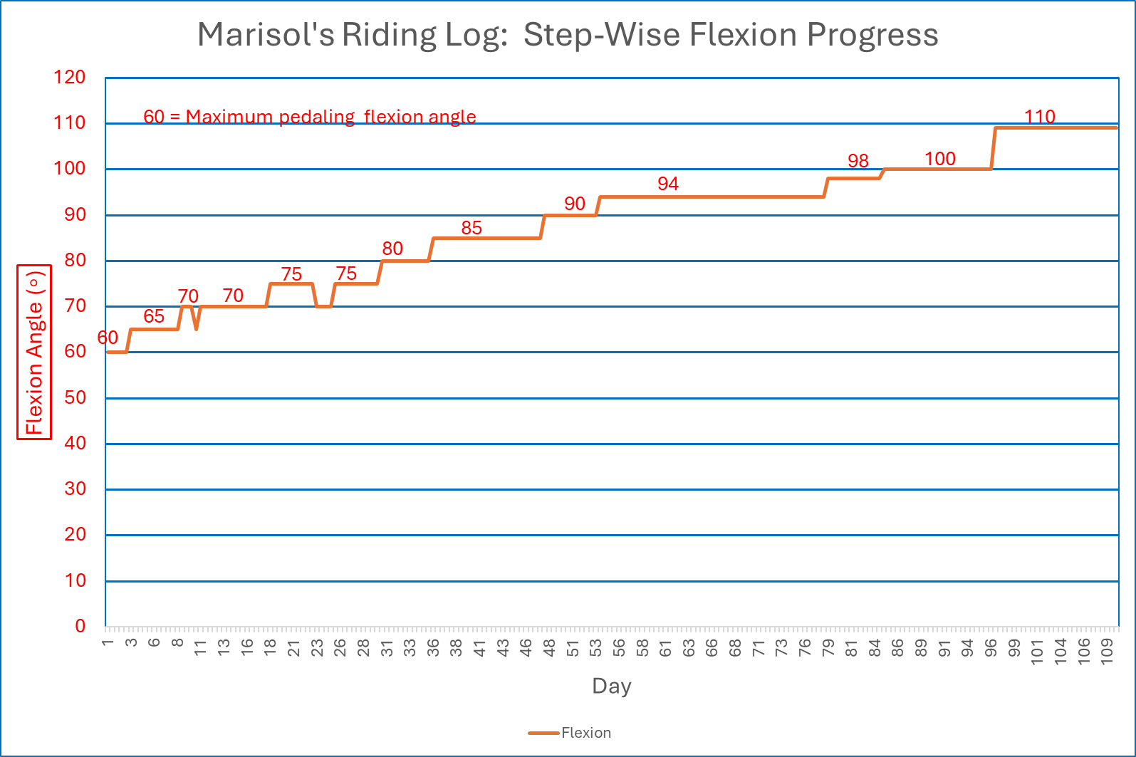The graph below shows the step-wise progress of her flexion over 109 days of OrthoBike riding therapy, starting at 60° and ending about 110°.